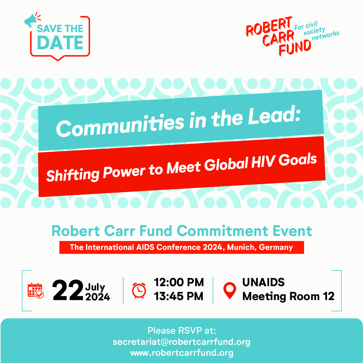 The Robert Carr Fund (RCF) is honored to extend an invitation to you for the Robert Carr Fund Commitment Event, titled “Communities in the Lead: Shifting Power to Meet Global HIV Goals,” to be held during the International AIDS Conference 2024 in Munich, Germany.