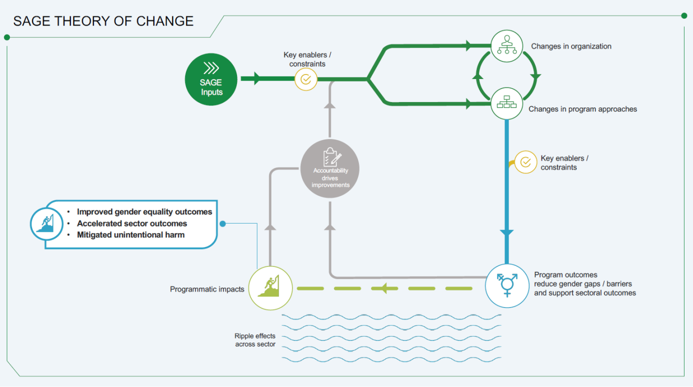 The SAGE Theory of Change (ToC) is a comprehensive framework for promoting gender equality (GE) within organizations and across sectors. It emphasizes both internal and external enablers, such as leadership buy-in, gender expertise, adequate financing, and organizational commitment to learning and innovation.