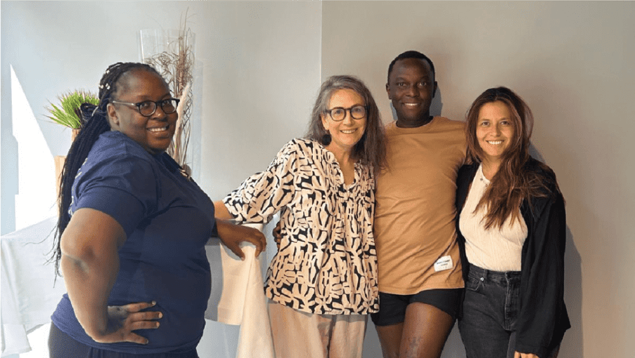 Photo taken during the Vibrant and Young Voices In-Person 2024 Consortium Meeting. From left to right: Maximina Yokonja, Executive Director of Y+Global; Luan Hatane, Executive Director of PATA; Monalisa Akintole, representative of the Youth Advisory Group; and Gabriela Romero, Senior Programmes Officer for Y+Global.
